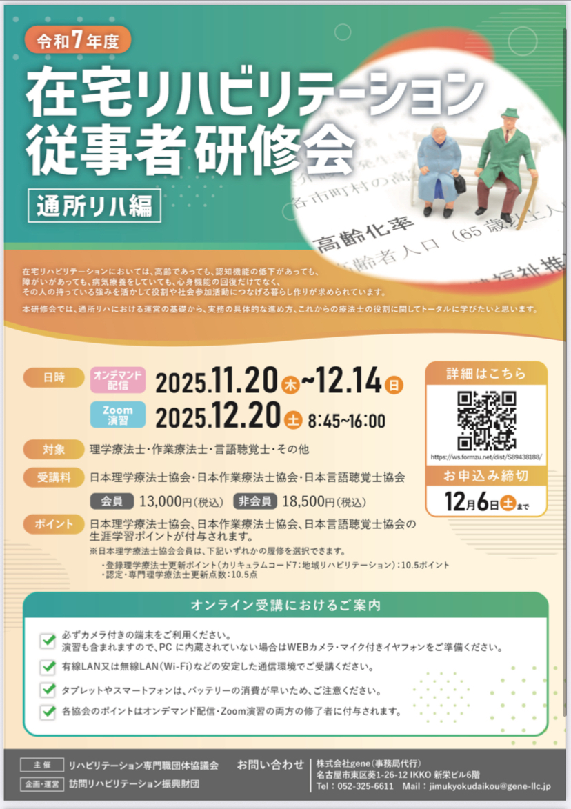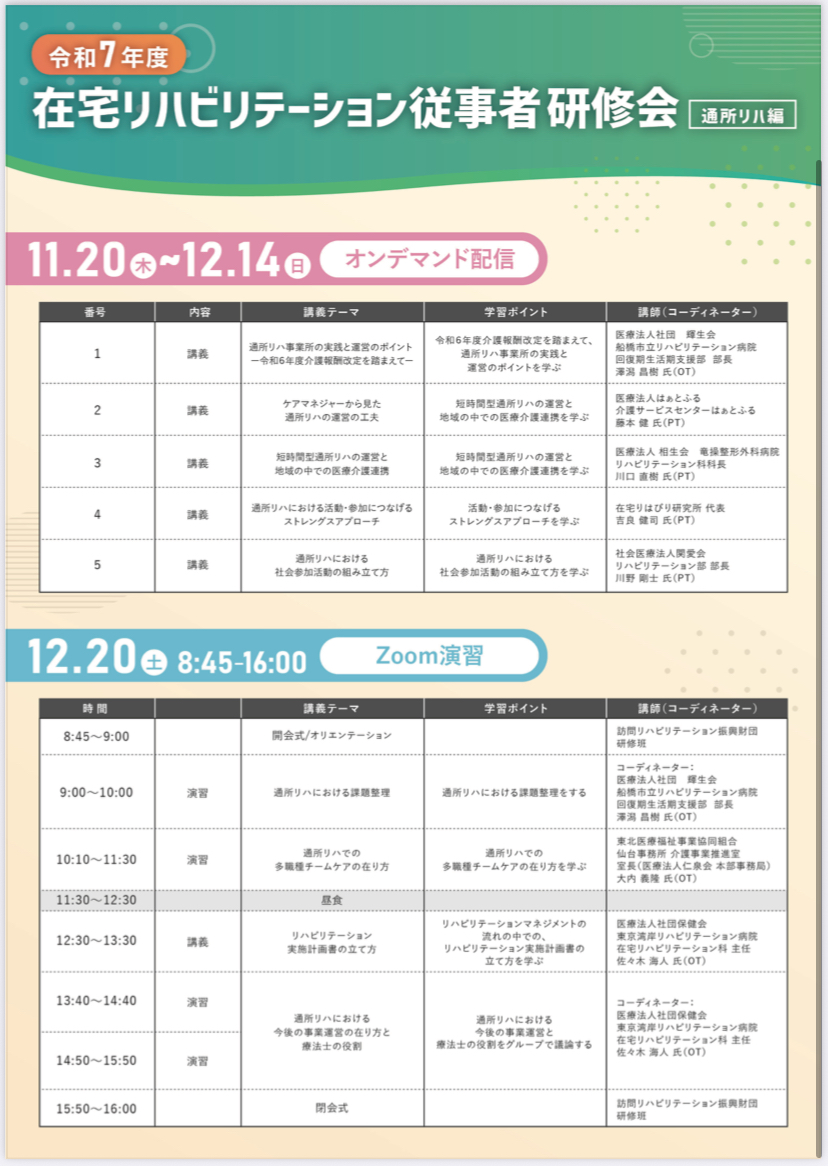 学会・研修会名 | 令和7年度 在宅リハビリテーション従事者研修会 ≪通所リハ編≫ |