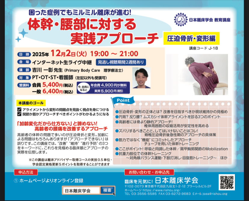 内容 | 困った症例でもミルミル離床が進む!体幹・腰部に対する実践アプローチ 圧迫骨折・変形編/高齢者の体幹の問題で多いのが圧迫骨折と変形。加齢による問題はもちろんありますが「アプローチできない」は誤りです。この講座では、“改善”“維持”“進行予防”の3つをキーワードに、これらを見極める臨床眼とアプローチの実際を伝授します。 |