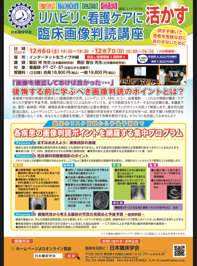 内容 | リハビリ・看護ケアに活かす 臨床画像判読講座/本講座では、整形・脳神経・呼吸・循環各疾患の画像所見判読に必要な情報を、ベテランがポイントを絞って解説します。 |