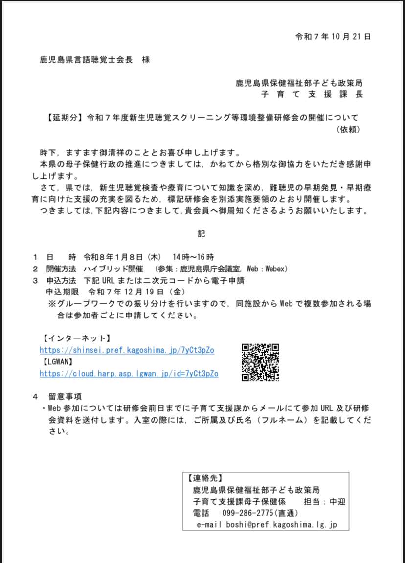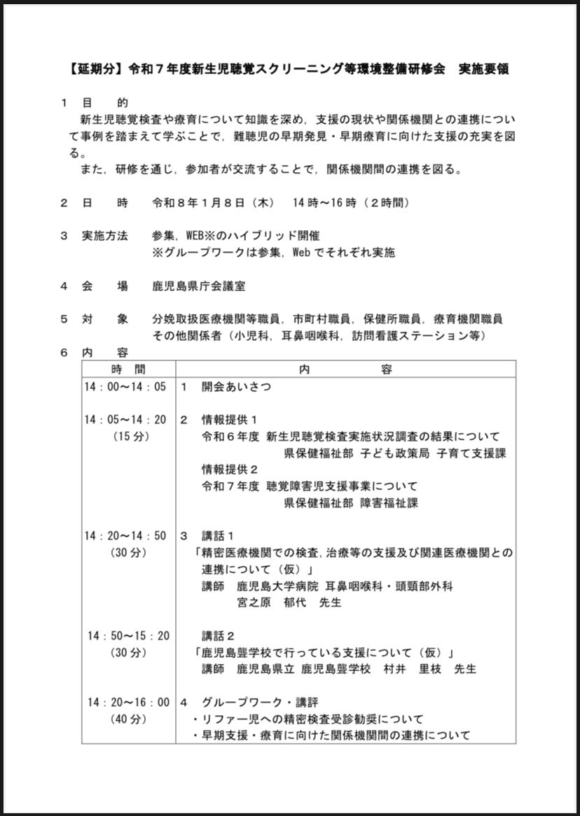 | 学会・研修会名 | 令和7年度新生児聴覚スクリーニング等環境整備研修会 |