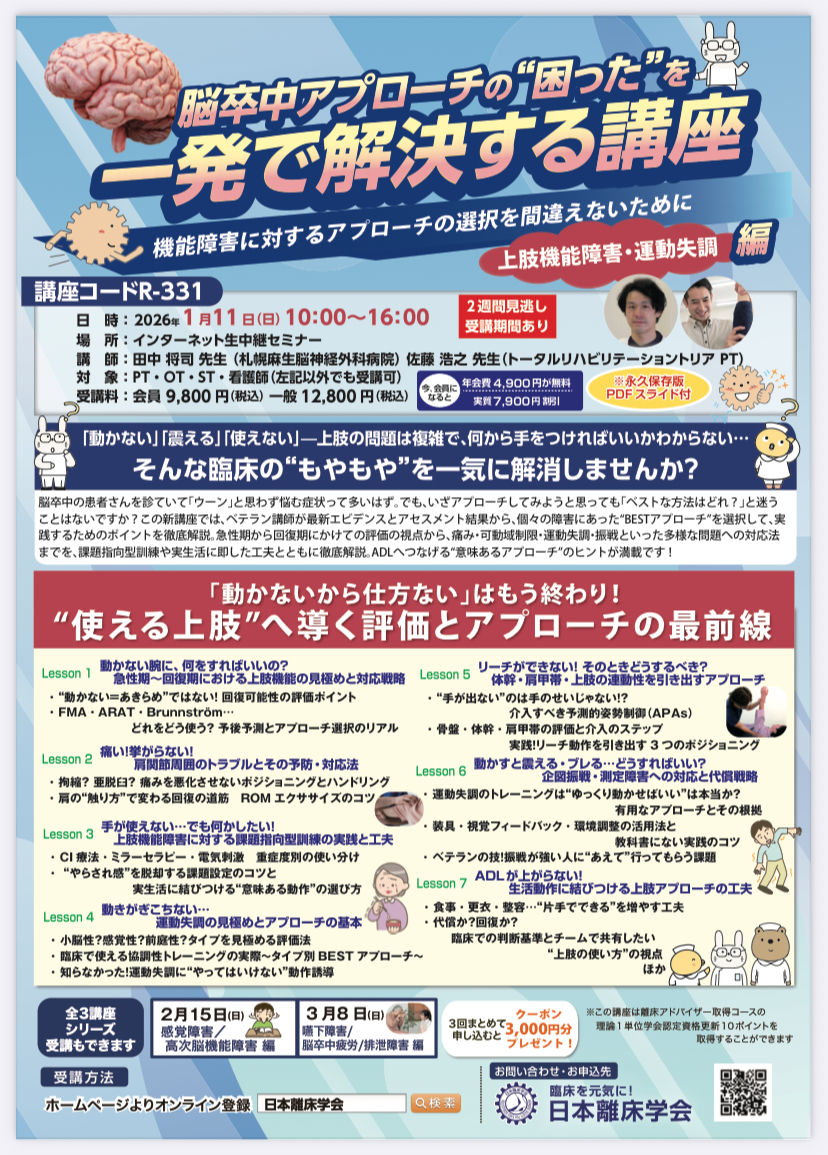 | 内容 | ◯脳卒中アプローチの“困った”を一発で解決する講座 上肢機能障害・運動失調編◯この新講座では、ベテラン講師が最新エビデンスとアセスメント結果から、個々の障害にあった“BESTアプローチ”を選択して、実践するためのポイントを徹底解説。 |