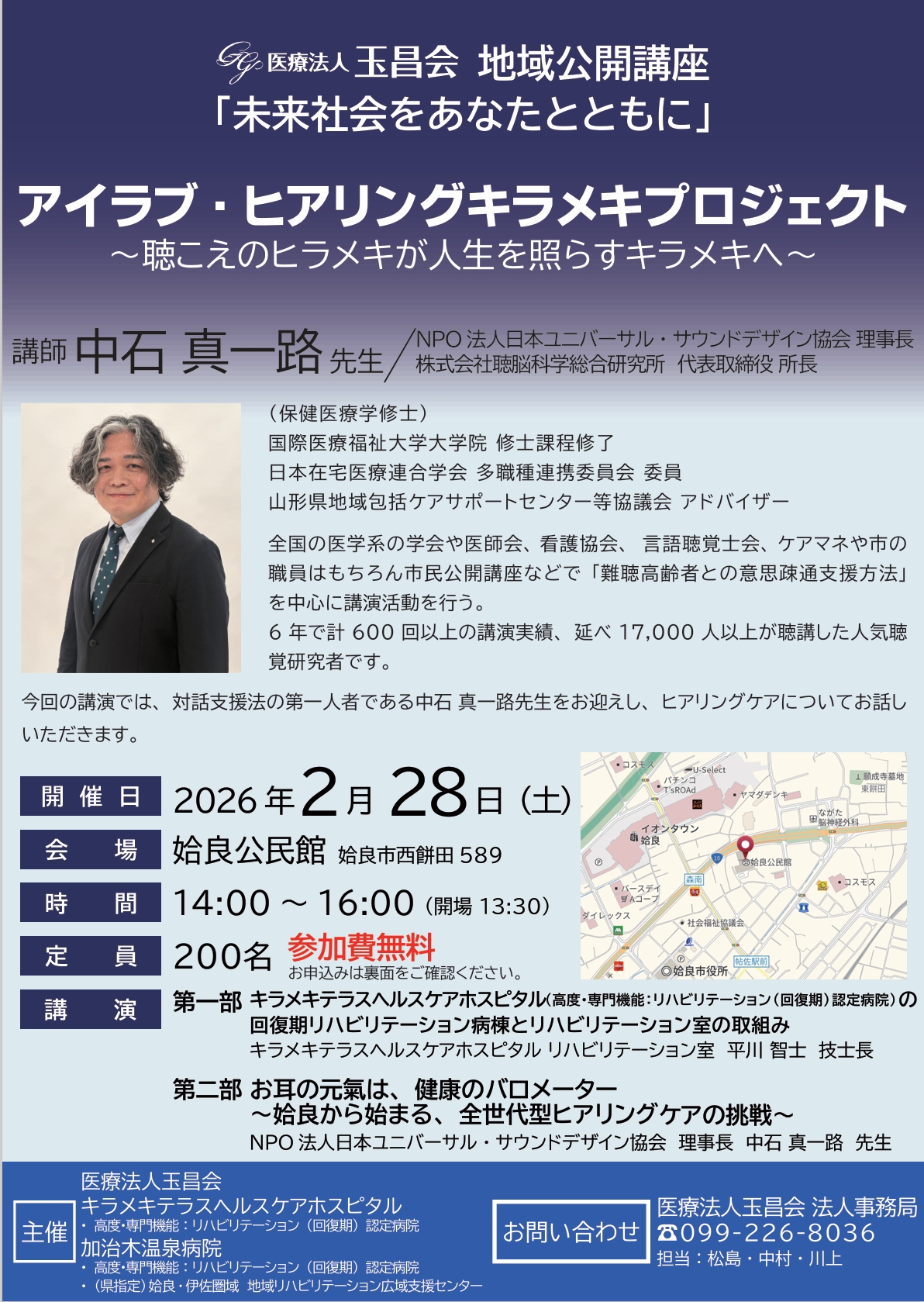 | 内容 | 今回の講演では、対話支援法の第一人者である中石 真一路先生をお迎えし、ヒアリングケアについてお話しいただきます。 第一部:「キラメキテラスヘルスケアホスピタル(高度・専門機能:リハビリテーション(回復期)認定病院)の回復期リハビリテーション病棟とリハビリテーション室の取組み」 講師:キラメキテラスヘルスケアホスピタル リハビリテーション室 平川 智士 技士長/第二部:「お耳の元氣は、 健康のバロメーター ~姶良から始まる、 全世代型ヒアリングケアの挑戦~」 講師:NPO法人日本ユニバーサル・サウンドデザイン協会 理事長 中石 真一路 先生 |