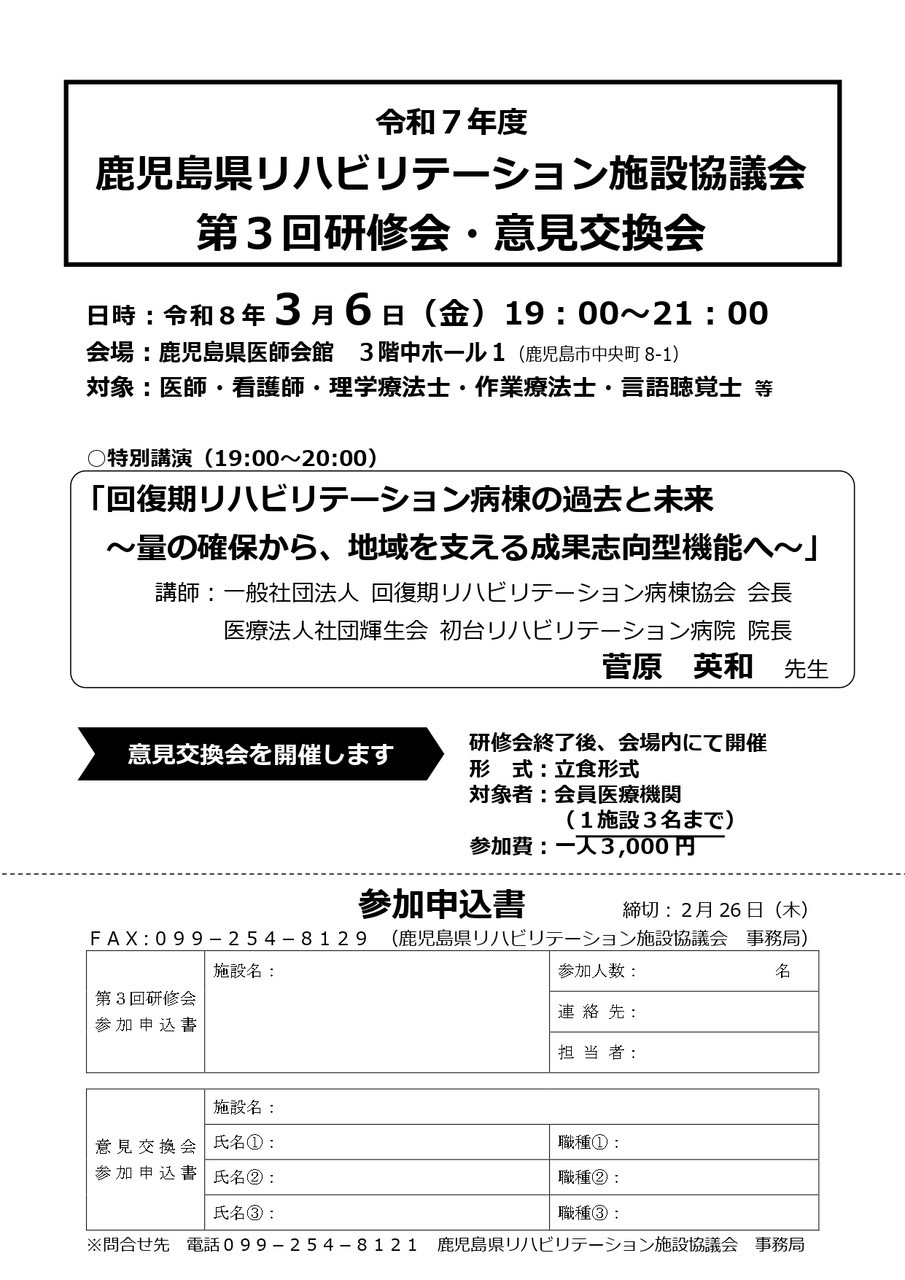 | 学会・研修会名 | 令和7年度 鹿児島県リハビリテーション施設協議会 第3回研修会・意見交換会 |